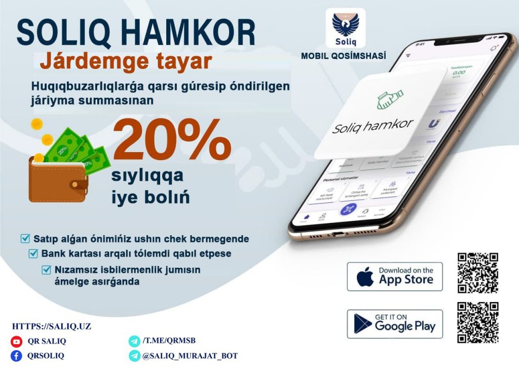 ♻️2022-jıl 1-yanvardan salıq huqıqbuzarlıqları haqqında “Soliq” mobil qosımshasınıń “Soliq hamkor” bólimi arqalı xabar bergen puqaralarǵa huqıqbuzarlıqlardan óndirilgen járiyma summasınıń 20 procenti muǵdarında sıylıq tóleniwi belgilengen.