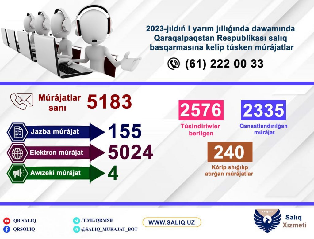 2023-jıldıń I yarım jıllıǵı dawamında Qaraqalpaqstan Respublikası salıq basqarmasına kelip túsken múrájatlardıń sanı 5183 ti quraydı.