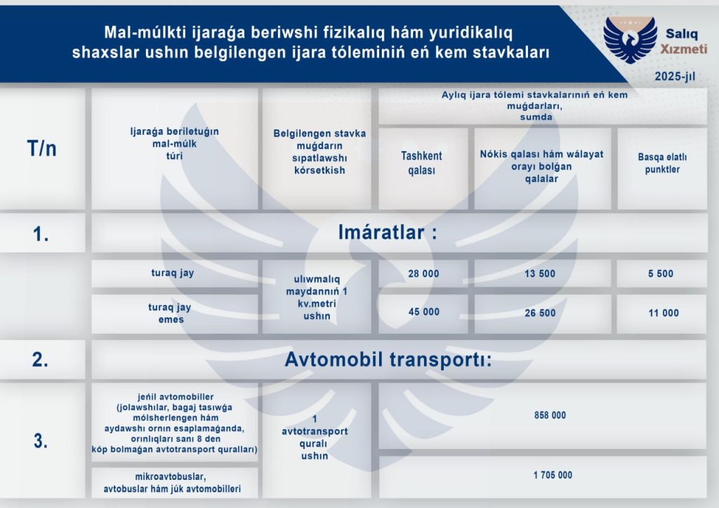 2025-jılda fizikalıq hám yuridikalıq shaxslar ushın ijara tóleminiń minimal stavkaları