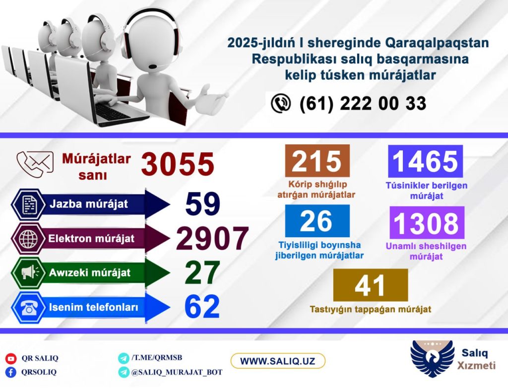 2025-jıldıń I shereginde Qaraqalpaqstan Respublikası salıq basqarmasına fizikalıq hám yuridikalıq shaxslardan jámi 3 055 múrájatlar qabıl etilgen.