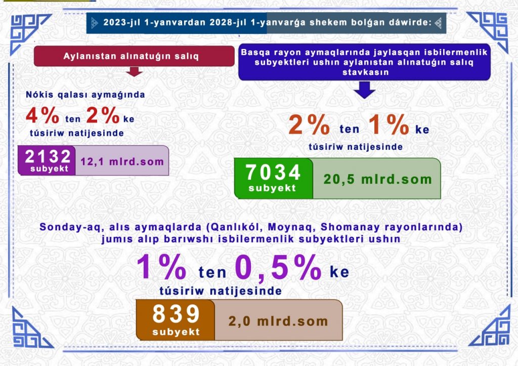 Sonday-aq, alıs aymaqlarda (Qanlıkól, Moynaq, Shomanay rayonlarında) jumıs alıp barıwshı isbilermenlik subyektleri ushın aylanıstan alınatuǵın salıq stavkasın 1 procentten 0,5 procentke túsiriw nátiyjesinde 839 isbilermenlik subyektlerinde 2,0 mlrd. som qarjılar ıqtıyarında qalıwı kútilmekte.